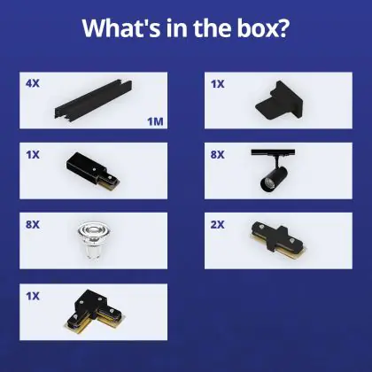 | Nom du fabricant | Complete L shaped 1-Phase Track Set Black incl. 8x Spot fixture + GU10 2700K 3W Dim – 2 x 2 meter i | |