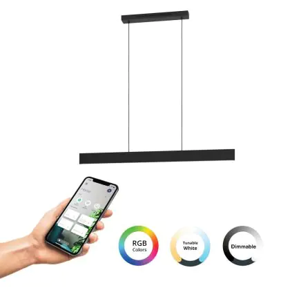 Le Eglo Connect.Z Smart Suspension Luminaire Andreas-Z Acier Noir 38W 4600lm - 827-865 Variable Blanc + RGB | Dimmable doté d’un culot se distingue par les points suivants. La température de couleur de 2700K - 6500K Blanc accordable + RGB Kelvin, laquelle vous permettra de fournir une lumière de qualité et adaptée à votre environnement! Le code couleur, 827-865 Tunable White + RGB, n’inclut pas seulement la température de couleur, mentionné précedement, il indique également l’indice de rendu des couleurs. Cette caractéristique rend compte du naturel des couleurs des objets éclairés. L’indice de rendu des couleurs pour ce produit est de 80-89 - Bon rendu des couleurs , idéal pour son utilisation. Ci-dessous vous trouverez une liste des nombreux avantages de cette référence.