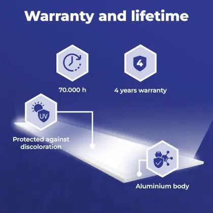 L'achat de ce panneau LED de 120x30cm est un excellent choix pour de multiples raisons. Avec une durée de vie moyenne de 70000 heures, vous êtes assuré d'avoir un produit durable qui fonctionne de manière optimale pendant de nombreuses années. De plus, vous faites votre part pour un environnement plus propre, car l'éclairage LED réduit les émissions de C02 et ne contient pas de substances toxiques comme le mercure.
