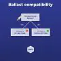 Un ballast régule la tension. Il permet de faire fonctionner les lampes qui ne peuvent pas être directement connectées à la tension du secteur. Y a-t-il un starter dans votre luminaire ? Il s'agit d'un ballast conventionnel (EM). Les luminaires équipés d'un ballast électronique (HF) n'ont pas de starter. Un driver LED, quant à lui, peut être comparé à un ballast électronique, il ne fonctionne qu'avec un éclairage LED.