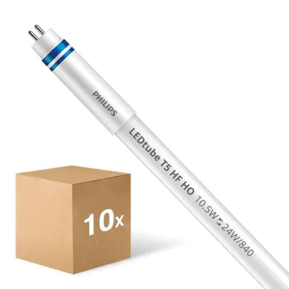 Le Lot 10x Philips Tube LED T5 MASTER Instantfit (HF) High Output 10.5W 1600lm - 840 Blanc Froid | 55cm - Dimmable - Équivalent 24W est l’alternative parfaite à votre ancien tube TL5 de 24W pour les luminaires avec un ballast électronique. Le tube LED T5 assure une durée de vie plus étendue et vous profitez de la garantie totale Lampdirect.be de 5 ans.