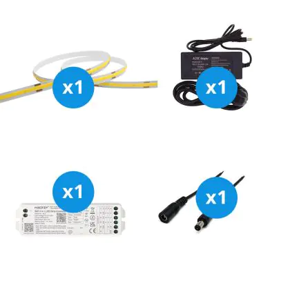 Le grand avantage de cet kit complet est qu'il comprend tous les accessoires nécessaires pour installer le ruban LED dans votre maison ou vos locaux professionnels. Nous vous fournissons la matériel nécessaire pour l'installation du ruban LED. Ensuite, vous branchez le tout sur une prise électrique standard. Vous trouverez toutes les informations nécessaires dans notre blog sur l'installation. Ce kit comprend :