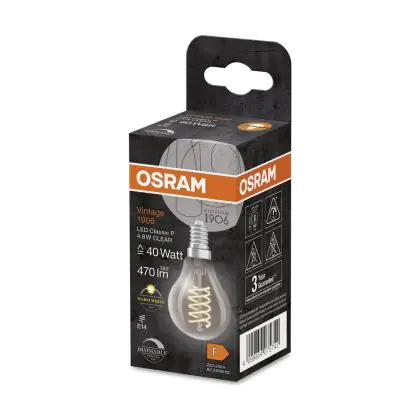 Description Osram Vintage 1906 LED Classic Slim E14 Poire Filament Claire 4.8W 470lm - 827 Blanc Très Chaud | Dimmable - Équivalent 40W