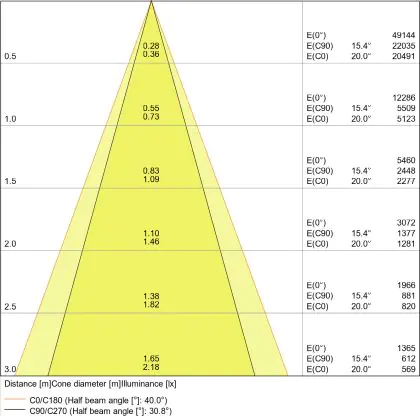 De lichtopbrengst en de gradenbundel spelen een grote rol. Zo geeft de lichtopbrengst van 5400 Lumen in combinatie met de 38° stralingshoek deze inbouwspot een specifieke toepassing. Kort samengevat is een lichtintensiteit van maximaal 400 Lumen ideaal voor accentverlichting, terwijl hogere waardes goed gebruikt kunnen worden als basisverlichting. Over het algemeen geldt: hoe breder de gradenbundel, hoe geschikter deze is door basisverlichting. Dit komt doordat het licht over een groter oppervlak wordt verspreid. Smallere gradenbundels (tot 40°) kunnen echter bij hoge plafonds ook goed tot hun recht komen als algemene verlichting.