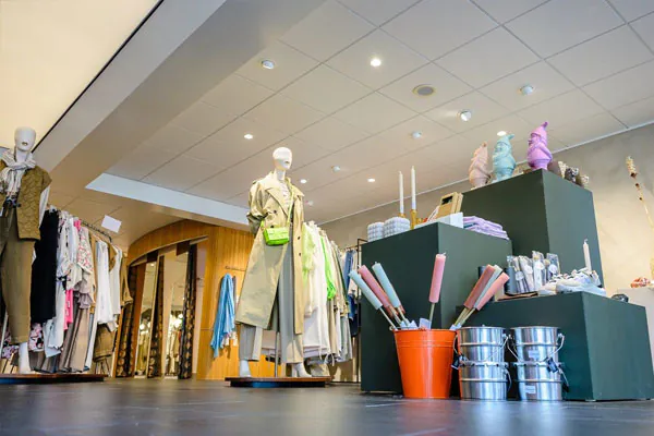 - In de winkel zijn uitsluitend wit gekleurde armaturen gebruikt, wat zorgt voor een rustig plafond. De bezoeker heeft hierdoor direct oog voor het assortiment (geen afleidingen).